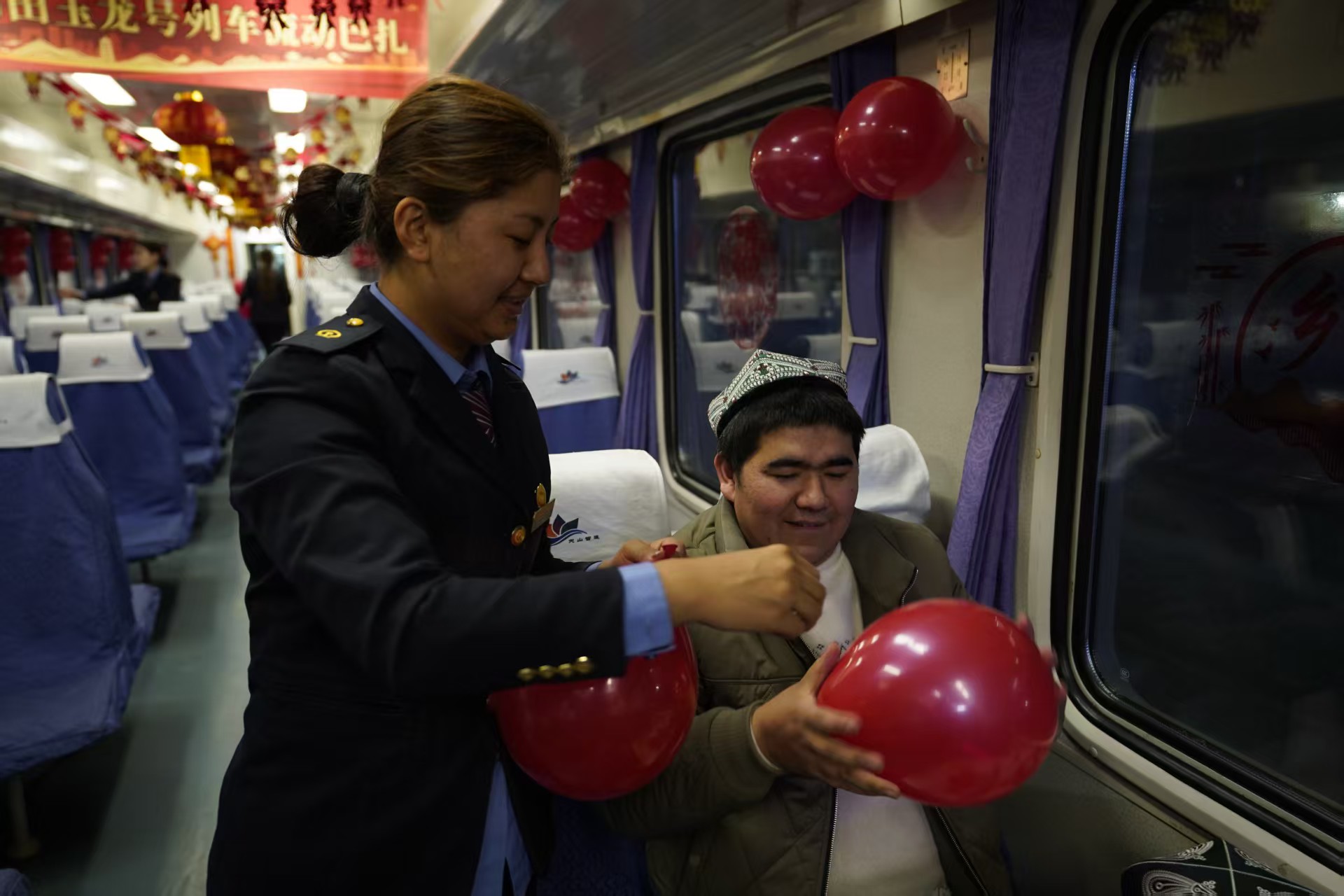 临近春节,列车工作人员与旅客共同布置车厢。新华社记者 白志强 摄