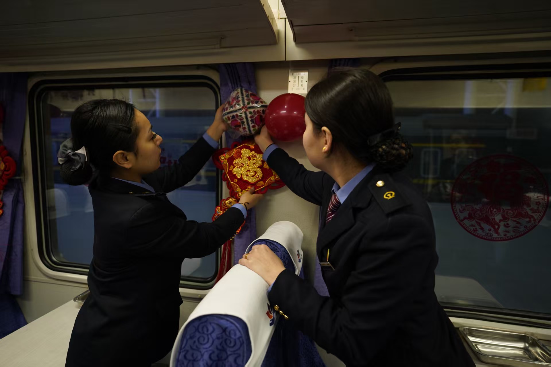 列车工作人员正在装点车厢,为列车增添年味。新华社记者 白志强 摄