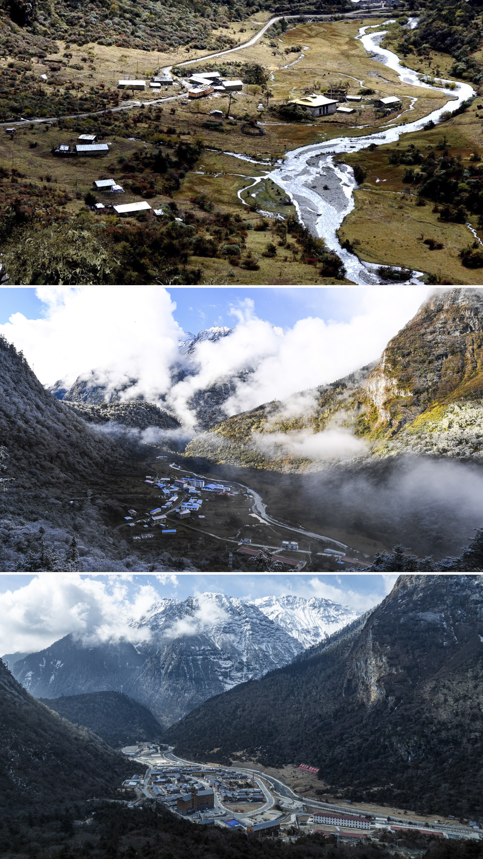 拼版照片:上图是2003年10月26日拍摄的玉麦乡(新华社记者索朗罗布摄);中图是2017年10月31日拍摄的玉麦乡(新华社记者普布扎西摄);下图是2026年2月5日拍摄的玉麦乡(无人机照片,新华社记者 丁增尼达 摄)。