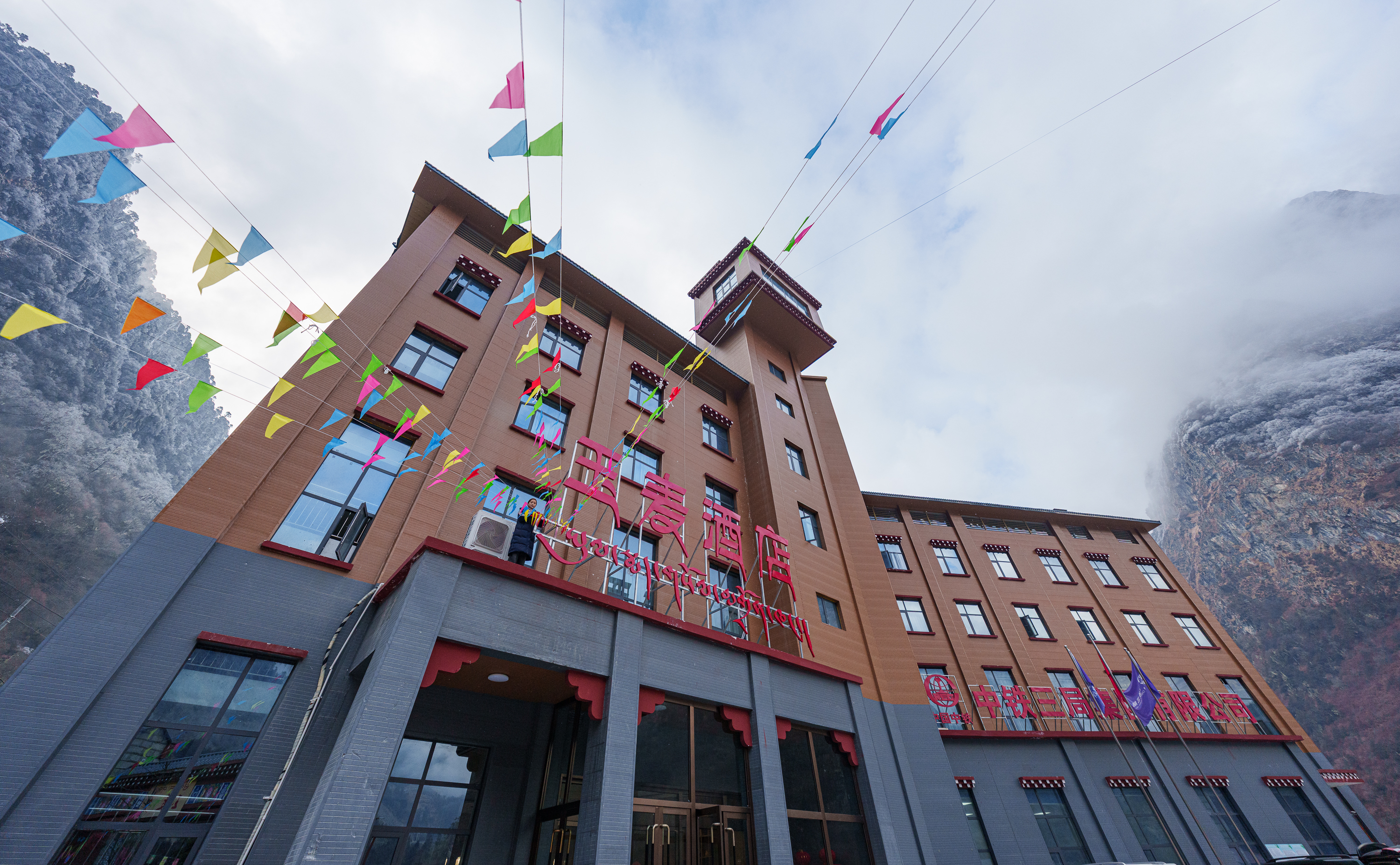 2月5日,玉麦酒店员工挂彩旗迎接即将到来的春节和藏历新年。新华社记者 丁增尼达 摄