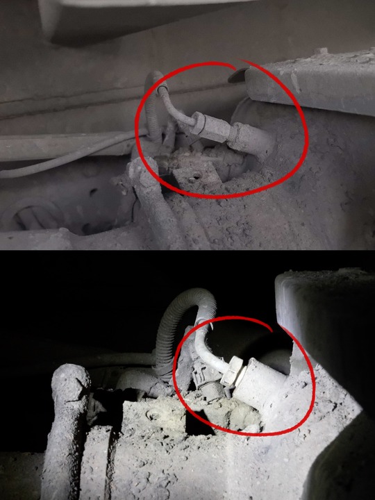 拼版照片:上图为大货车尿素喷射系统的后处理器上被加装螺丝的状态,下图为拆掉螺丝恢复正常的状态。(2025年9月24日摄)