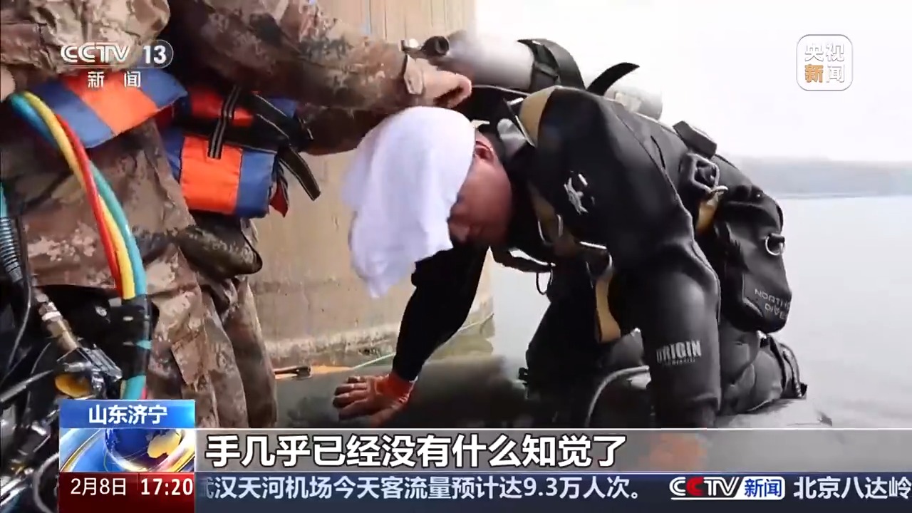 中国铁路济南局铁道战备舟桥处桥梁水下检测队执行经理 高佳旺:手几乎已经没有什么知觉了,头部稍微冷点。反正听到这个车从桥上走过,再想想我们所做的这些东西,所做的检测,觉得特别值得。