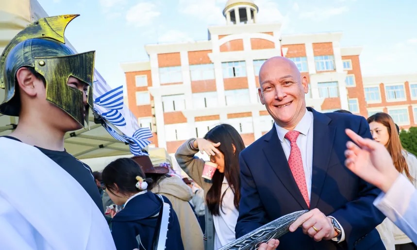 Stephen校长与中国有着深厚的情感联结。作为中国女婿和两个孩子的父亲,他不仅深切理解中国家庭对于子女教育的重视与期待,更以开放和尊重的态度积极融入中国文化。从努力练习中文到体验筷子文化,其幽默与真诚背后,是对中西教育理念融合的深入思考。他倡导将中国“立德树人”的传统智慧与国际前沿教育方法相结合,旨在营造一个“既有学术高度,又有人文温度”的学习共同体。