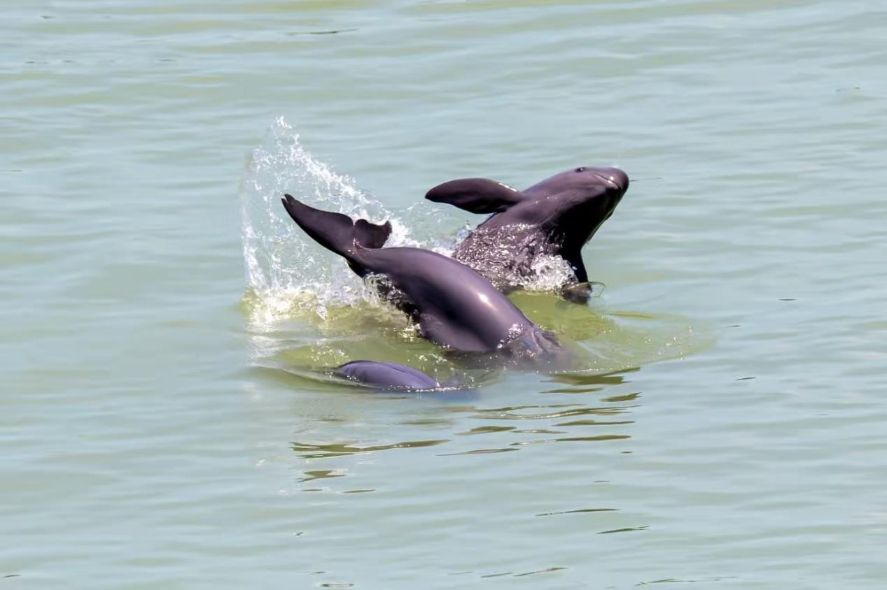 在长江宜昌段葛洲坝下游江面上,三头江豚在追逐嬉戏(央广网发 杨河 摄)