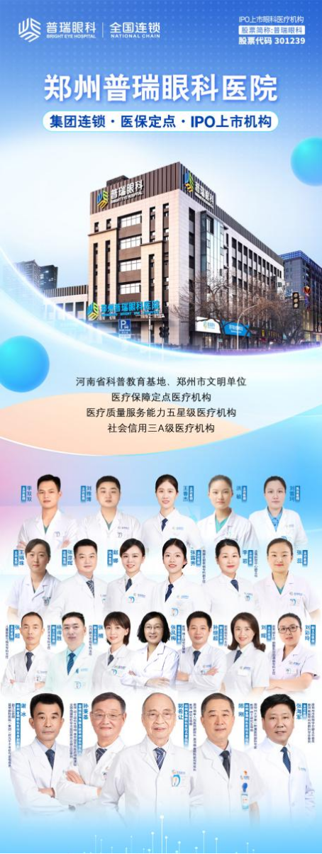 郑州普瑞眼科医院自2007年建院以来,始终深耕中原地区眼健康事业。医院设有眼底病、角膜病及眼表、白内障与老视、屈光手术、儿童眼病与视光、青光眼、中医眼科、眼整形、泪道病等九大特色专科,汇聚国内名医名家,19年来已为数十万患者提供了高品质的眼科诊疗服务。