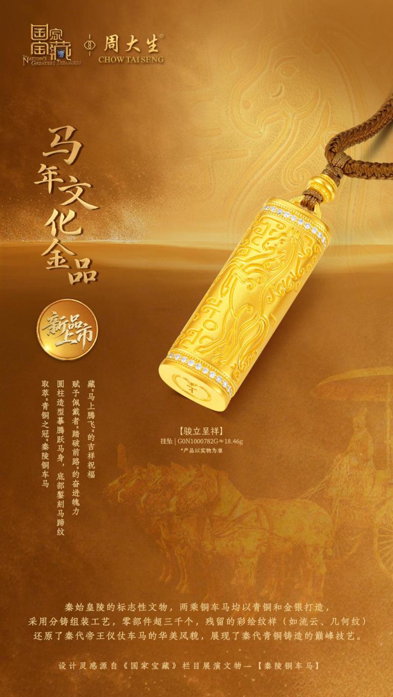 应时而颂,骏马喜迎新岁岁逢丙午,马跃新程。周大生×国家宝藏吉庆金·瑞马系列应运而生,从秦陵铜车马的庄重雄健,到唐代昭陵六骏的飘逸奔腾中汲取灵感,生动诠释“马到功成”、“一马当先”的进取精神。作为马年生肖款的“骏立呈祥”挂坠,灵感溯源于秦陵铜车马,造型洗练,以流畅金线勾勒骏马静立之姿,稳健沉着,马蹄踏金,寓意踏破前路、马上腾飞。“骏踏祥瑞”足金方牌,则别出心裁,马首可随势轻转,招财开运,灵动有趣;牌身通体以卷草纹和万字符双纹护佑,寓意“生生不息”与“万福万寿”。