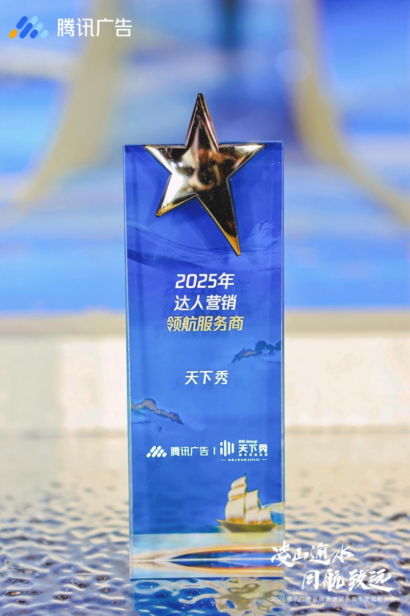 2月2日,以“凌山逾水,同航致远”为主题的2026腾讯广告品牌渠道服务商年度战略大会在宁波圆满落幕。大会汇聚众多生态合作伙伴,共同回顾过往征程、展望新年战略,并隆重颁发了四项年度重磅荣誉奖项。天下秀凭借在达人营销领域的卓越表现,荣获“2025年达人营销领航服务商”称号。