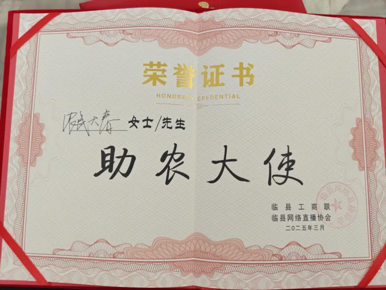 临县工商联为@农民大春 颁发的荣誉证书。(图/受访者提供)