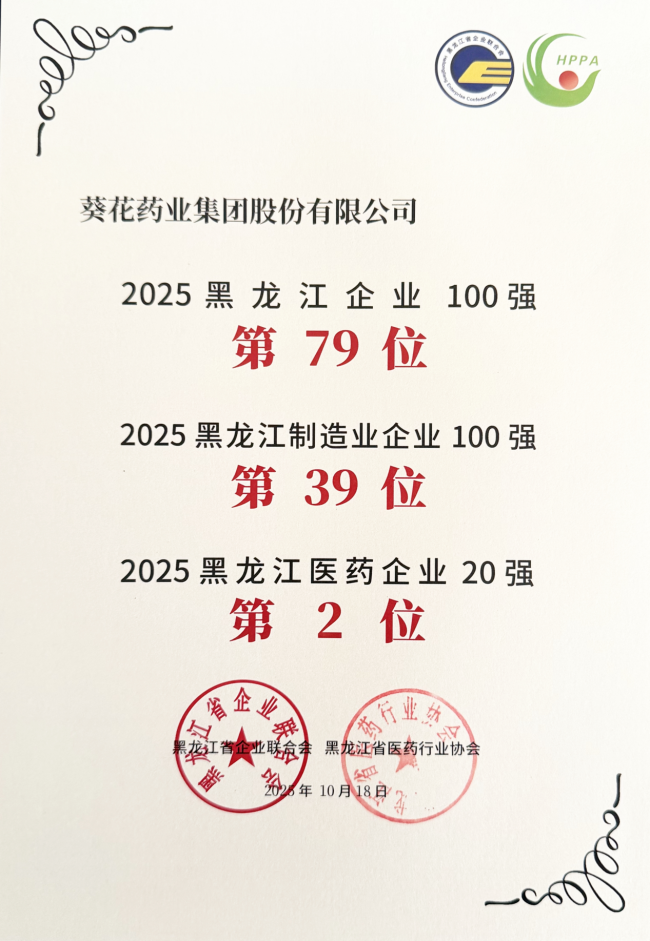 本次大会还同步发布“2025黑龙江企业100强系列榜单”,葵花药业凭借稳健的发展态势和突出的行业表现,成功登榜三项权威榜单,具体排名为“2025黑龙江企业100强”第79位、“2025黑龙江制造业企业100强”第39位,同时入选“2025黑龙江医药企业20强”第2位,位居黑龙江民营医药企业之首。
