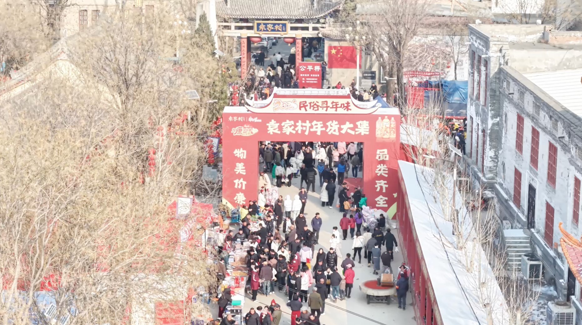 记者:我现在所在的位置是陕西咸阳礼泉县的袁家村,还没进村,就被村口大集的热闹气氛所包围。这些年来,袁家村的游客接待量在陕西旅游景区一直是名列前茅的。去年春节期间,这里的旅游营收达到了1.8亿元,如此亮眼的数字、如此高的热度,这个村子的魅力究竟是什么呢?又快过春节了。今天,我们就一起到村子里看一看。