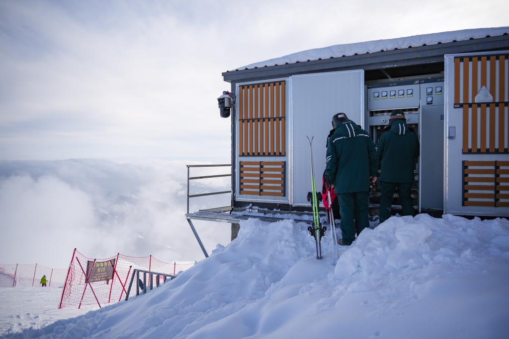 齐凡和哈依沙尔带着雪具乘缆车抵达海拔2800米的云霄峰顶,这里是高级雪道的起点,也是电力保障的重中之重。
