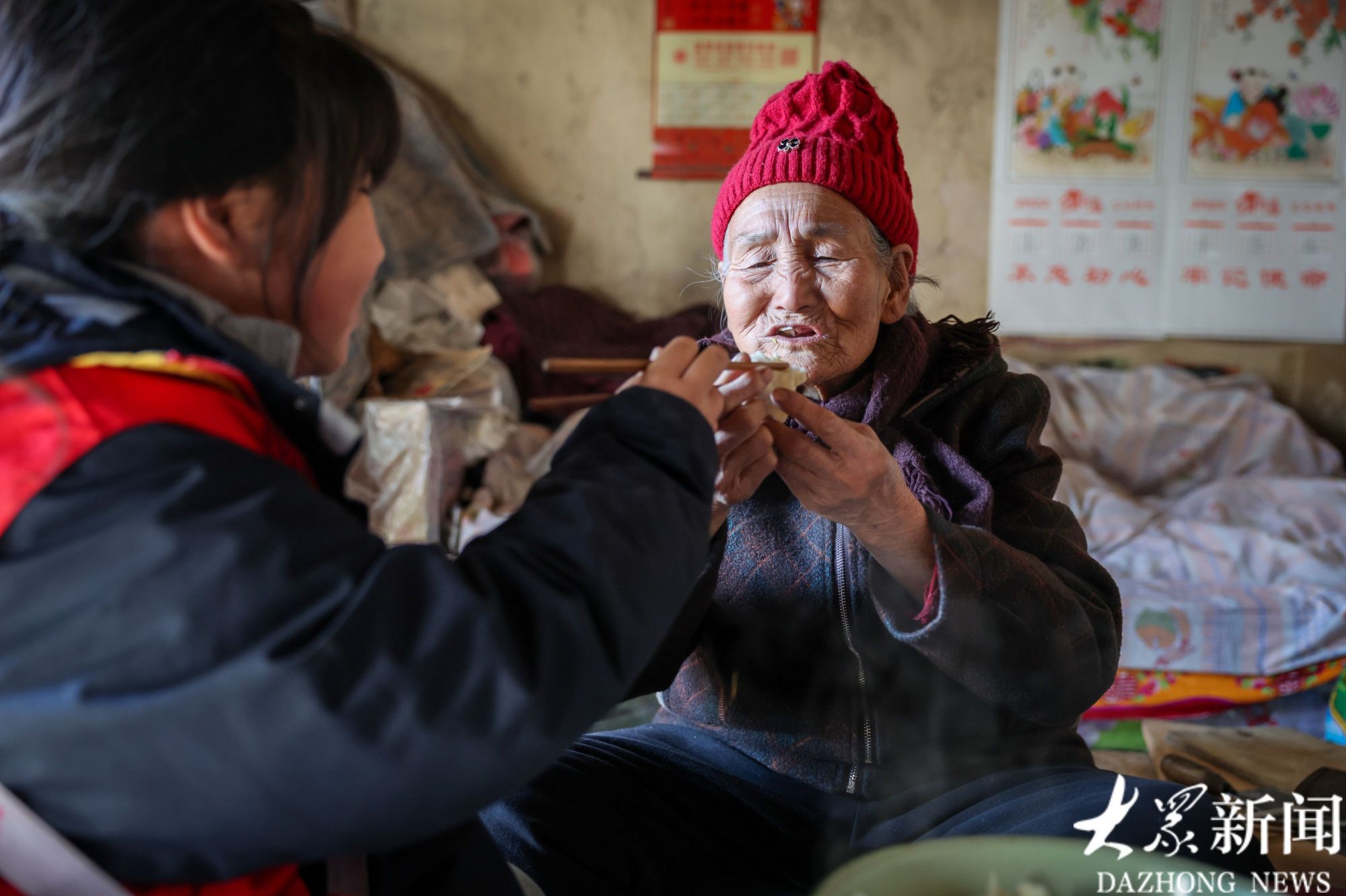 小志愿者刘梓瑜陪李元花吃饺子“过小年”。