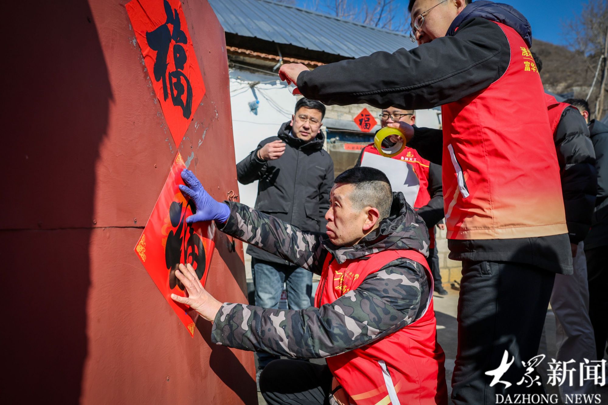 志愿者来到村民家里,给贴上福字、春联。