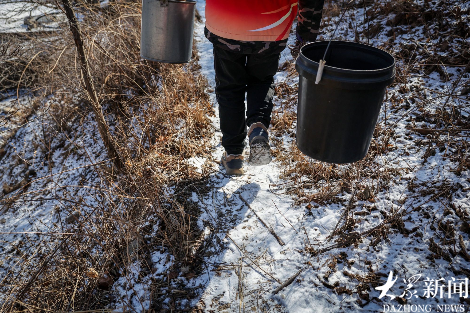 挑水的路不好走,两名志愿者换班挑。