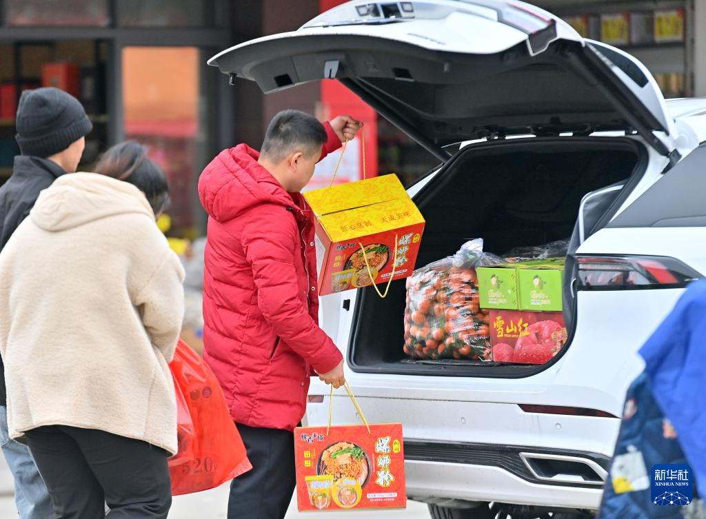 2月11日,在柳州市柳南区瑞龙路一家农产品批发市场,市民将年货搬上车。新华社记者 黄孝邦 摄
