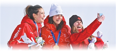 自由式滑雪女子坡面障碍技巧决赛后,亚军中国队选手谷爱凌(左)和冠军、季军合影。
