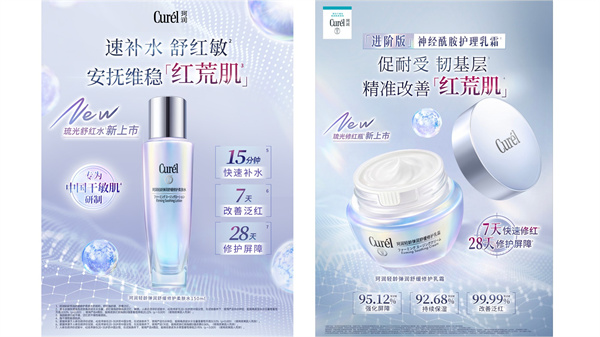 花王旗下专注干燥性敏感肌护理品牌“Curél珂润”的珂润轻龄弹润“琉光修红*3”系列,专为呵护“红荒肌”人群设计,致力于强韧肌肤屏障,应对换季时的干燥、泛红与细纹问题。系列中的“珂润轻龄弹润舒缓修护乳霜(琉光修红瓶)”,堪称守岁熬夜的护肤“压轴嘉宾”。作为一款进阶版神经酰胺护理乳霜,它“促耐受,韧肌底”,通过稳定性成分和专利制剂技术*4高效补充神经酰胺功能物质*5,配合添加了萃取于沙漠中的生物成分依克多因*6的保湿化妆水“珂润轻龄弹润舒缓修护柔肤水(舒红水)”。从根源助力强化肌肤屏障,锁住水分。涂抹瞬间便能感受到深层的滋养与包裹感,帮助肌肤维持稳定、水润的状态。