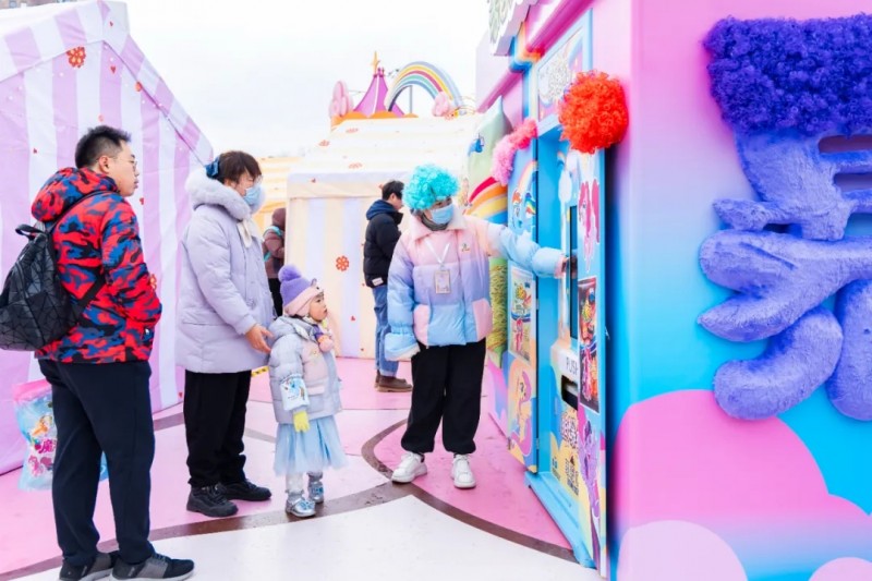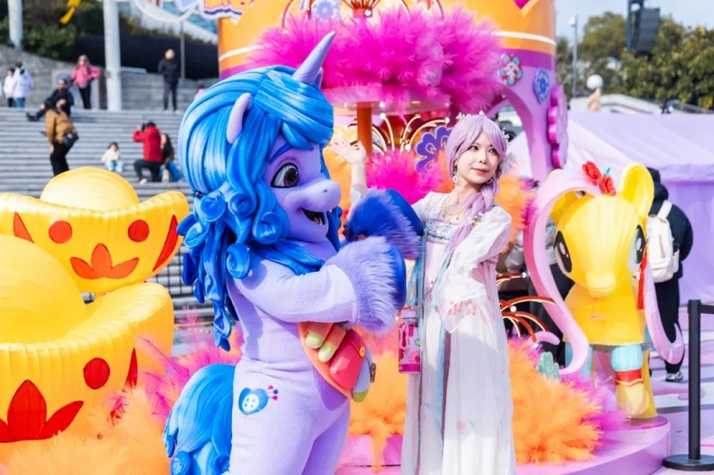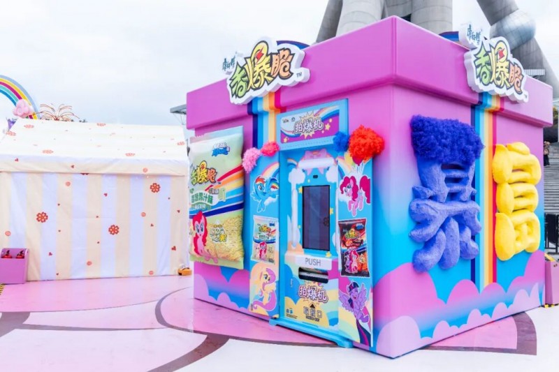 基于上述前提,2月6日起康师傅香爆脆携手小马宝莉在上海东方明珠塔下打造的“友谊魔法新春花园”,更像是一个沉浸式的体验场。通过主题装置、Cosplay魔法快闪、全员“爆炸头”造型等细节,配合魔法贴纸的持续收集机制、与顶级IP 的长期世界观绑定,这些借鉴了游戏与社群运营的设计,使得消费者从一个购买者,转化为一段魔法叙事的“持续参与者”。