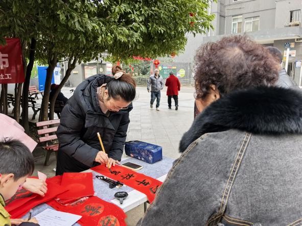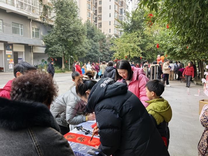 活动一开始书法互动区便排起长队。居民需先回答一道与春节习俗相关的知识题,答对后方可提笔挥毫。现场也有书法爱好者即席展示,红纸铺开,墨汁晕染。有居民说道:“今天领一个‘福’字回家,打算贴在家门口,让福气从自家传到邻里。”