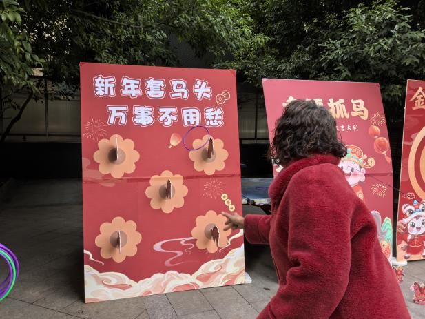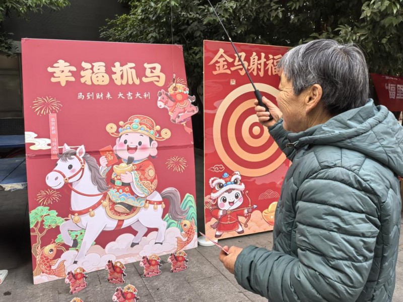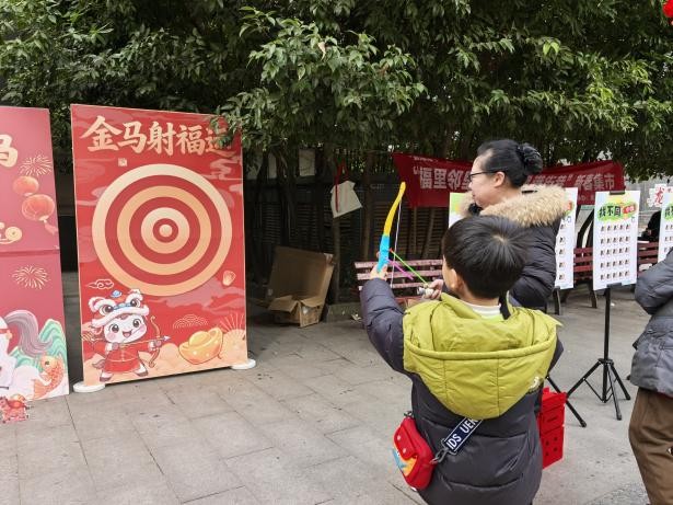 而在另一边的文化互动区,幸福抓马、新年套马头、金马射福运游戏都寓意着“抓住幸福”、“套住新年鳌头”、“射中福气与好运”等。老人手持钓竿专注捕捉福马,年轻人挑战套圈精准度,孩子们则拉弓射箭,每一环都引来阵阵加油。