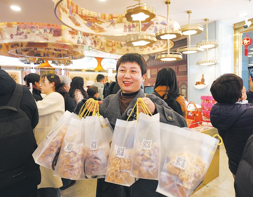 2月12日,隆福寺北京稻香村门店的年货“三件套”——蜜三刀、奶油麻花和开花枣,依旧是新春市集的“人气王”,店内挤满了排队购买“三件套”的市民与游客,几乎无处下脚。
