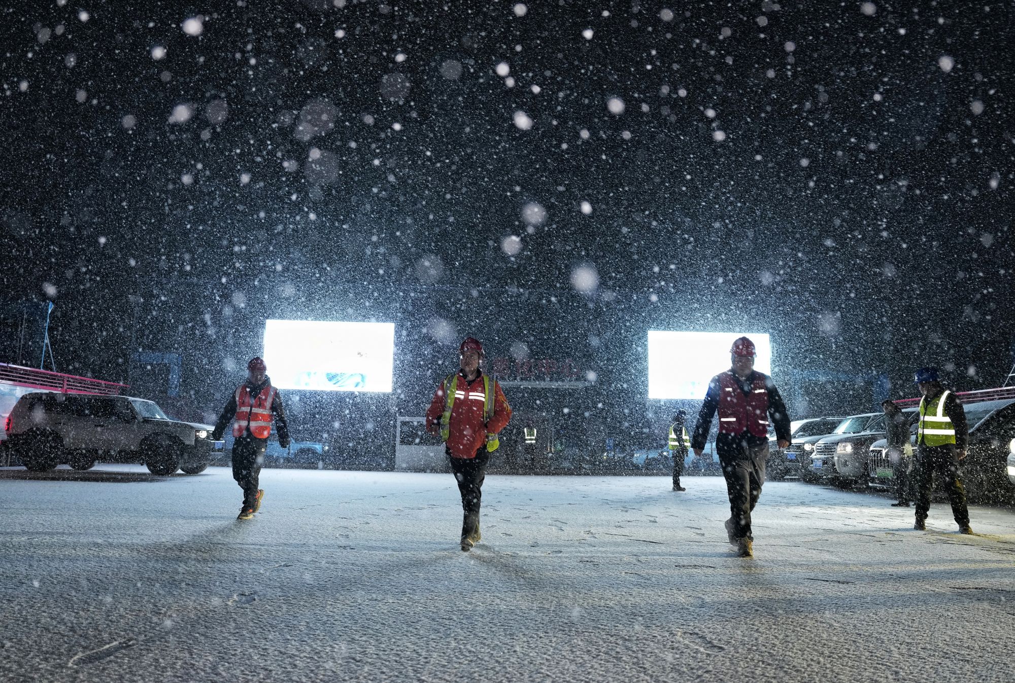 1月30日晚,折多山大雪纷飞,工人们在折多山隧道施工点位前。新华社记者刘坤 摄