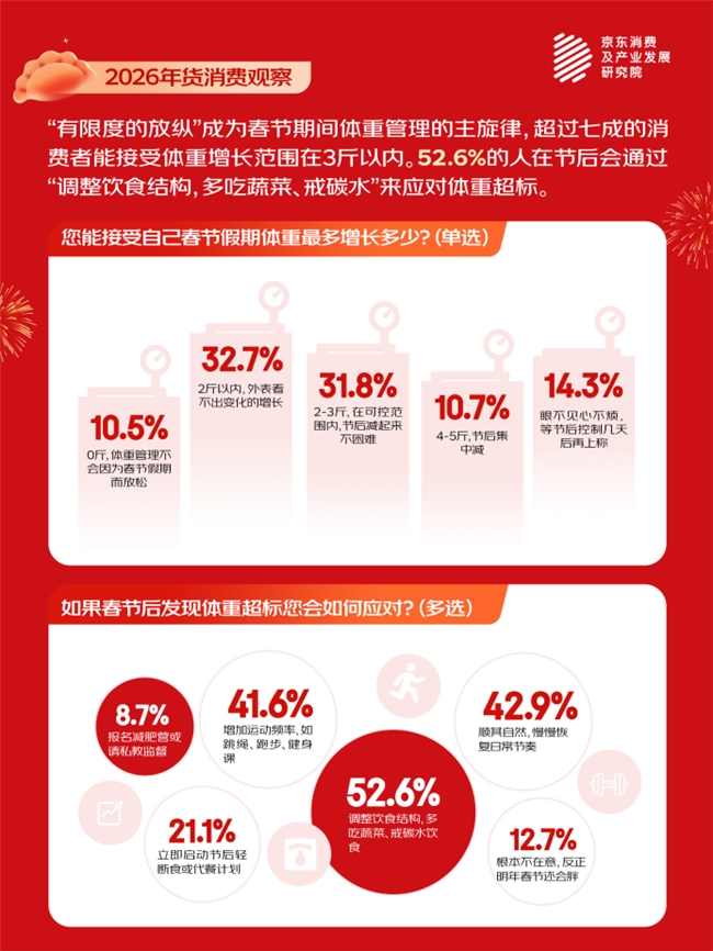 ·2025年很多人都开始进行体重管理,养成了更好的生活习惯。不过,过年是重要的家庭团聚与自我放松时段,吃喝这件事本身就是贯穿春节假期的重头戏,那么在吃喝与体重管理上,消费者会做出怎样的平衡?调研显示,能接受自己在春节吃胖的消费者占比达75%,他们表示“体重上升在预料之中”,但仅有10%的消费者能接受长胖在3斤以上。在体重管理的行为上则呈现出“两极分化”与“灵活平衡”并存的特征。其中,“习惯性维持型”(32.8%)属于日常已养成健康习惯带入到春假期间,无需刻意管理;“完全放松型”(31.1%)主张在假期中彻底放纵,节后再进行减重;“分段控制型”(23.6%)则表现为前三天放纵、随后进行控制,或在临近返工、返校前进行调整;“严格计划型”(12.1%)则每日对饮食与运动进行精准规划,享受节日与健康平衡成为主流态度。