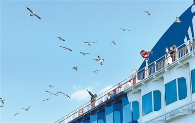 山东省烟台市,乘船前往大连的旅客在甲板上喂海鸥。唐 克摄(人民视觉)