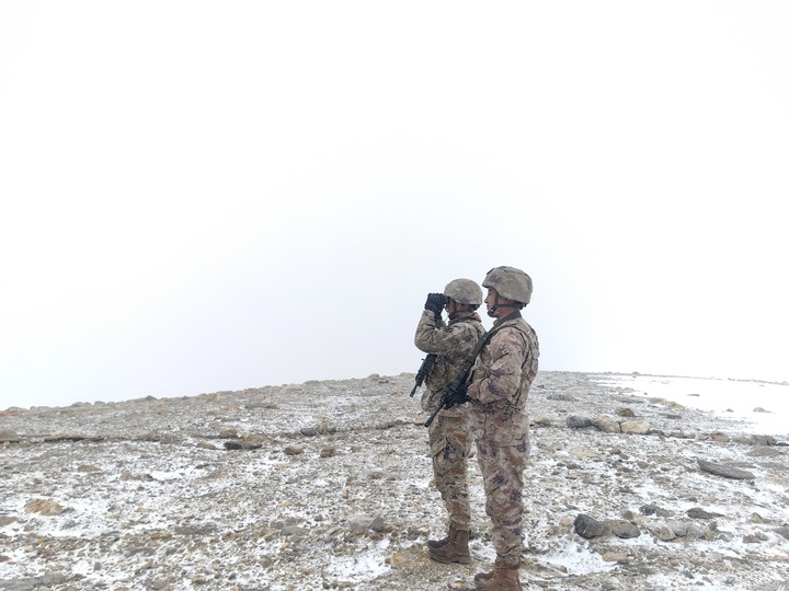 2月15日,西藏军区某边防团5592哨所官兵站岗执勤。新华社发(沈杰 摄)