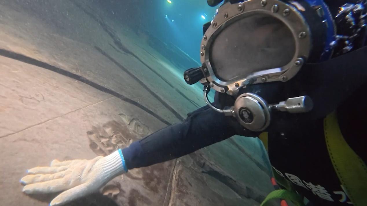 潜水员 赵春霞:每次潜水下去,就会有种穿越时空的感觉。你去清洗的时候,摸到石刻,你能够感受到古人的一笔一画,就好像古人在教我写字。每一次把它清理得更好,然后让它以最好、最完美的一种状态去展示给我们的游客。我自己是特别热爱这个事业的。