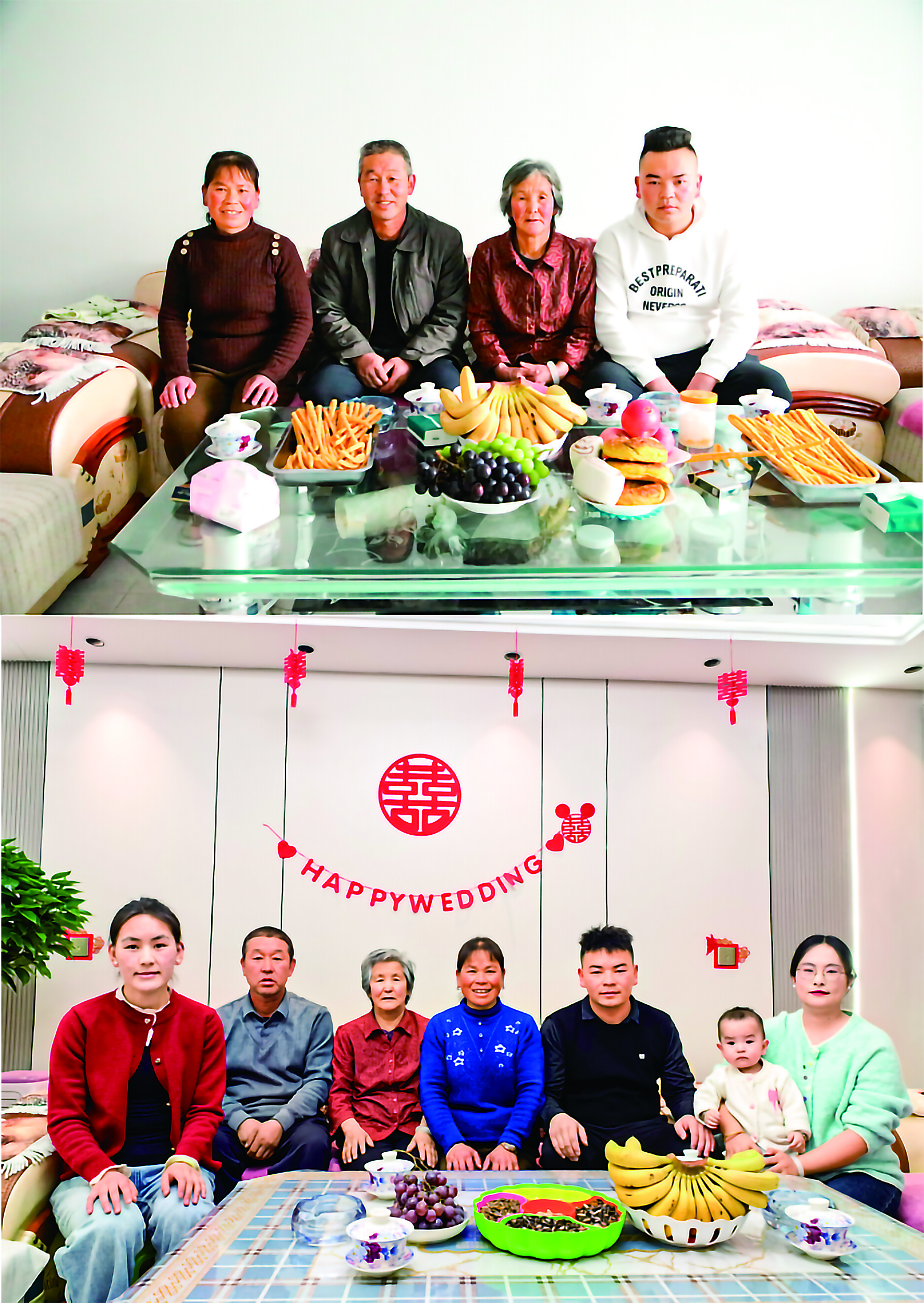 拼版照片:上图为甘肃省临夏回族自治州积石山县安集镇风林村村民白正录(左二)与家人在新家中合影。(2024年12月12日摄);下图为时隔一年多,记者再次回访白正录家中拍摄的照片。(2026年1月27日摄)。新华每日电讯记者张文静摄