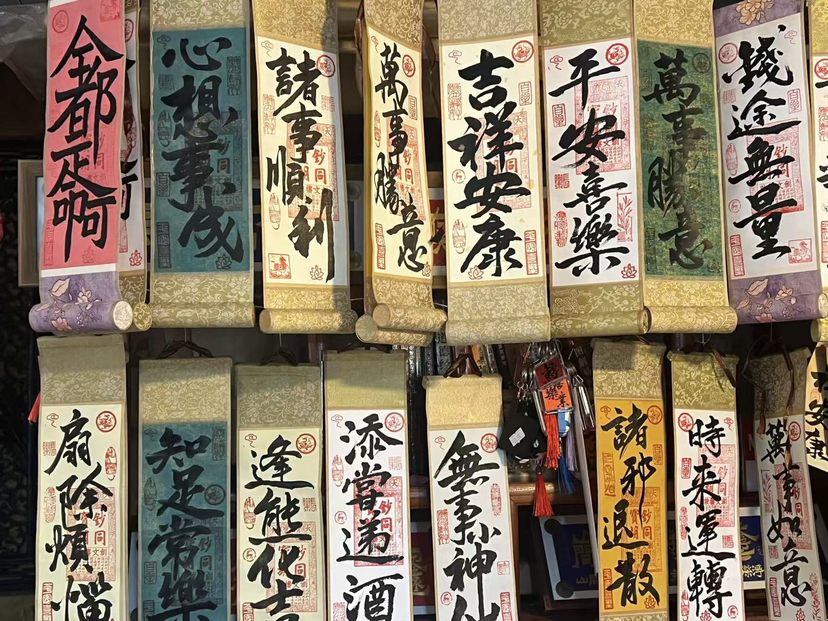 王建宇:25年的回头客比较多,他来过,在我这现场买了几副,回去以后又跟我这订做,这是自觉喜乐,这是给人设计的。这是给人家八十寿的老人,给他(写的)藏头诗。还有喜牌,就是人结婚写的合体字,喜上眉梢,龙凤呈祥,珠联璧合,双喜临门。年底写对联的还有摆台(特别多),一定百十来个,当伴手礼。