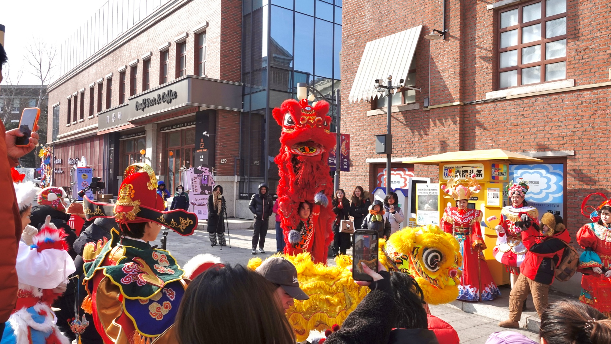 铿锵锣鼓响,民俗闹新春。随着一阵热闹的锣鼓声,新春巡游正式开启,将现场欢乐氛围推向高潮。“福禄寿喜财”五路神仙身着华服亮相,手持福袋向游客们派福送喜,两只灵动的醒狮踏着鼓点,时而跳跃腾挪,时而俯身作揖,与现场市民亲密互动,引得人群阵阵欢呼喝彩。大家纷纷拿出手机、相机,记录下这精彩的民俗瞬间,锣鼓声、欢笑声、拍照的快门声交织在一起,成为春京西街巷里最动听的新春乐章。
