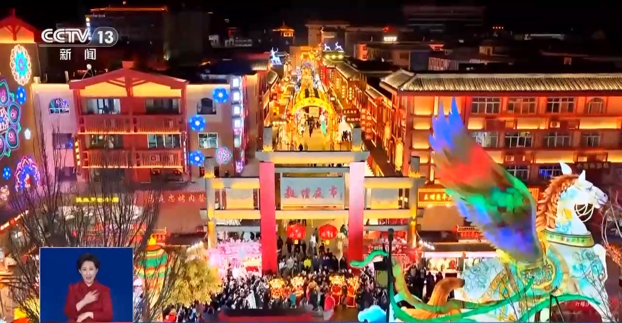 位于敦煌市区的一条步行街——敦煌夜市。今年春节假期,一场灯会将这里点亮,吸引许多市民游客来到这里。