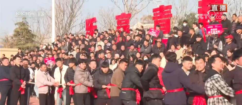 在现场,除了有二郎拳的表演,还有没有什么可以让大家都参与的体验项目?当然有,就是记者身后正在开展“拔河比赛”。比赛一共有58支参赛队伍,总参与人数超过2000人,大家看拔河绳中间,原本这里应该是红绳,现在却换成了土鸡或者有机蔬菜,哪方获胜就能获得对应的年货。