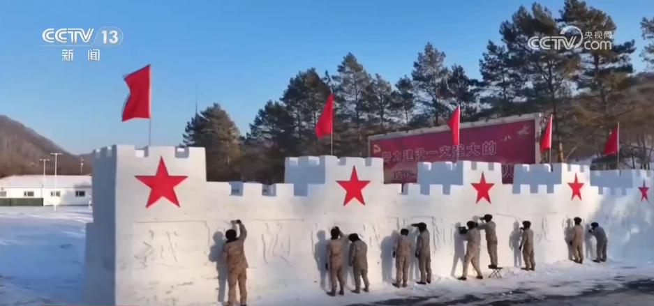 在联勤保障部队某仓库,官兵们在满山满谷的皑皑白雪中,用一双双巧手雕琢出充满联勤特色和军营文化的精美作品。