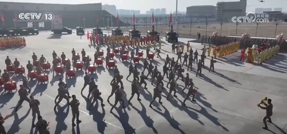 在武警第一机动总队某支队组织的团拜会现场,战车列阵、锣鼓喧天、龙狮齐舞,两架无人机悬挂着巨幅春联缓缓升空,这极具仪式感的一幕寄托了官兵们对新年度工作的憧憬与向往。