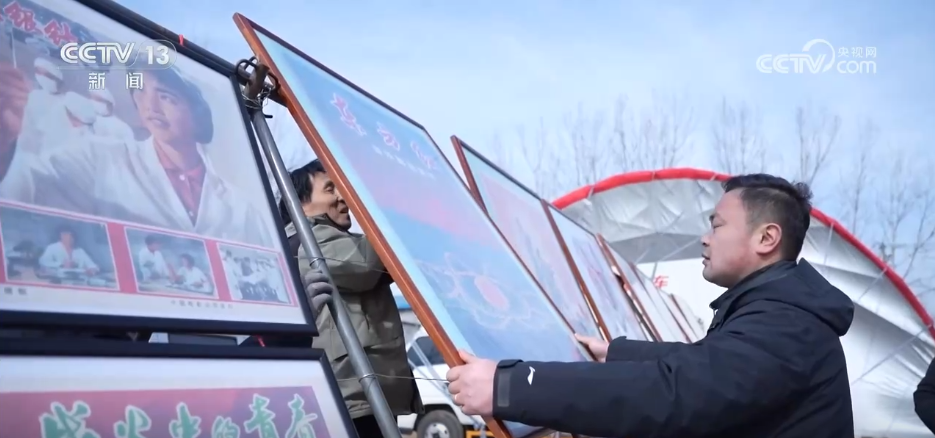 放映大棚外,电影元素深度融入乡村市集的烟火气中,打造“电影+”多元惠民服务综合体,融合同步开展的老电影海报展、惠民演出、书法送福、非遗手造展销、本地农特产品展销等活动,让乡亲们边看电影边逛集市,看大戏、办年货、品书香。据估算,现场赶大集的群众累计超过3万人次。