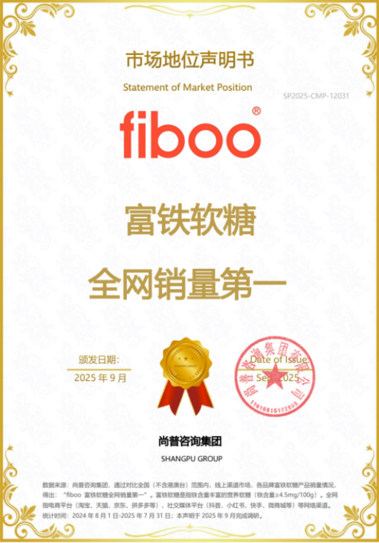 fiboo专注于女性营养健康。截至2025年9月30日,fiboo全渠道累计销量已交出亮眼成绩单:黑咖啡达2.13亿杯,功能性软糖达2.85亿粒。其在天猫、京东、抖音等平台的旗舰店始终位居品类前列,多款单品成为爆款——清晨咖稳居天猫回购榜榜首,蛋白棒不仅拿下天猫搜索指数第一,更在京东运动蛋白棒品类中排名首位。2025年9月,尚普咨询集团向湖南西子健康集团旗下女性运动新营养品牌fiboo颁发【fiboo 富铁软糖全网销量第一】市场地位声明书,fiboo成为女性健康营养赛道的代表性品牌之一。