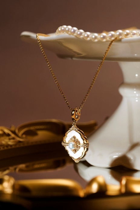 海派文化的精髓在于“融”,既保有传统的审美内核,又巧妙吸纳现代设计的理性结构,MiNG名皇珠宝的设计便体现了这种兼容并蓄的智慧。以“光年布朗-丝绒妆台珍珠吊坠”为例,设计师以现代几何美学为骨架,采用利落的菱形结构作为载体,菱形框架内镶嵌的珍珠母贝,在光线下流转着细腻温润的光泽,与珍珠的莹润相得益彰,尽显刚柔并济的审美巧思。整体既有几何造型的现代感,又不失温润柔和的质感气韵,轻松为穿搭增添几分低调的精致感。