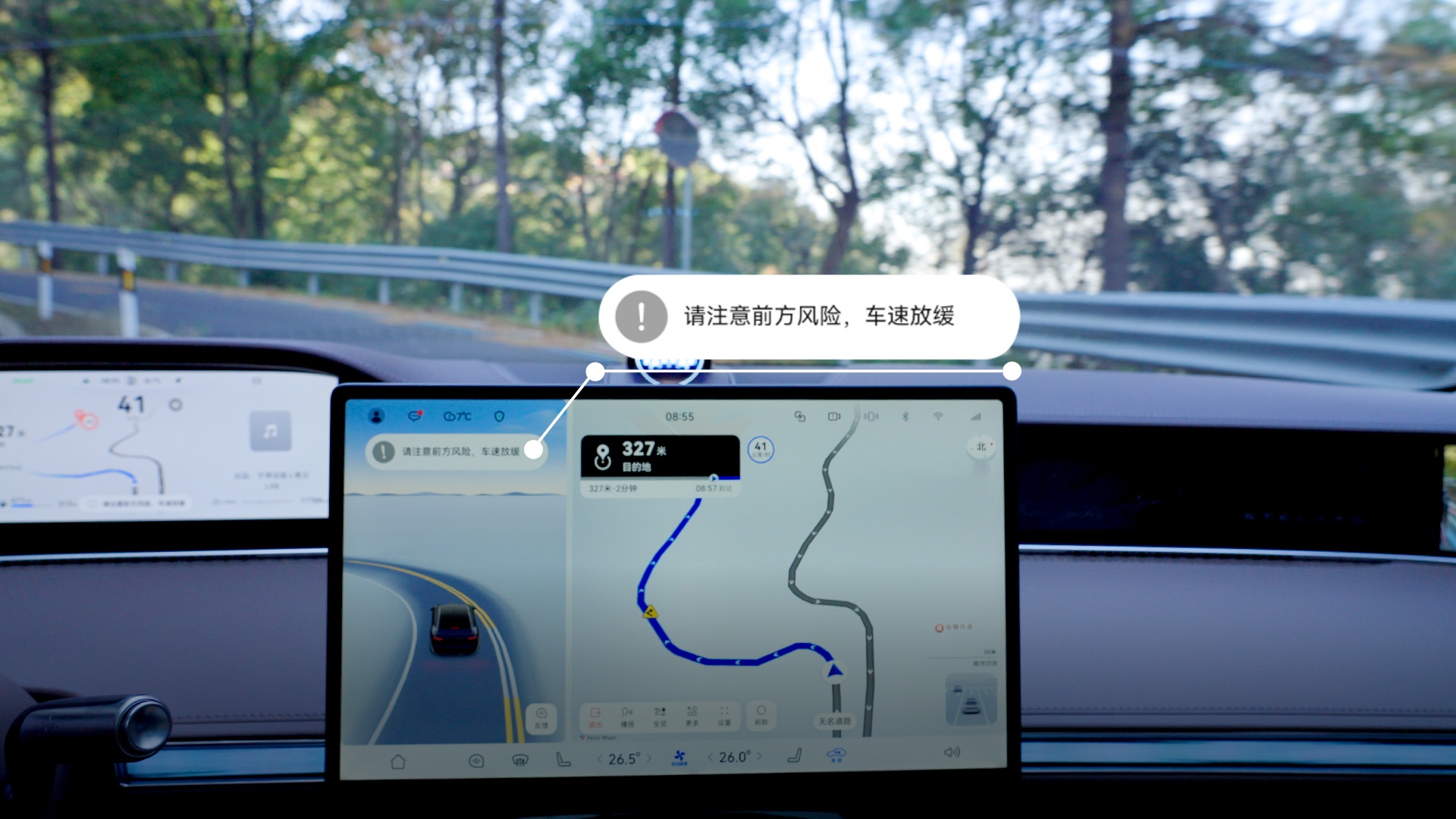 以人驾防御性限速为例,面对路口和急弯,当系统识别到以当前速度行驶存在碰撞风险时,车辆会自主放缓车速,并通过文字提示进行风险预警。