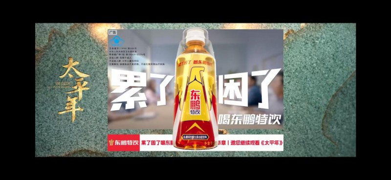 作为功能饮料行业的领军者,东鹏特饮多年来深耕影视营销,从《北上》《罚罪2》的爆款联动,到《八角笼中》《他是谁》的情感共鸣,始终坚持“内容+场景+用户”的三维逻辑,让品牌自然融入剧情肌理。在《太平年》的影视营销中,东鹏特饮的创可贴广告精准把握剧集播放节奏,在剧情推进的关键间隙自然露出,既不打断观众的观剧体验,又能通过清晰的产品画面、耳熟能详的Slogan,快速唤醒消费者的品牌记忆。同时,品牌并未局限于单一的中插形式,而是创新采用“破屏品牌标板”形式,当剧情进入关键节点时,以裸眼 3D 效果强势吸睛,在不打断观剧体验的前提下,实现自然的节奏过渡,让品牌存在感贯穿全程。