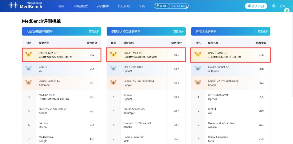 在大模型行业从百模大战步入淘汰赛的当下,一种务实的共识正在撕裂虚幻的泡沫:通用大模型的博学在商业落地中往往意味着平庸。云知声近期在MedBench 4.0评测中以94.6分的成绩斩获医疗智能体冠军,并包揽三项第一,对“通用能力迷信”完成彻底祛魅。