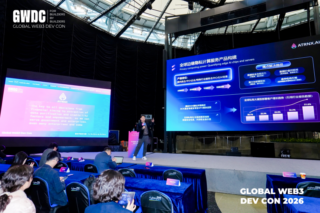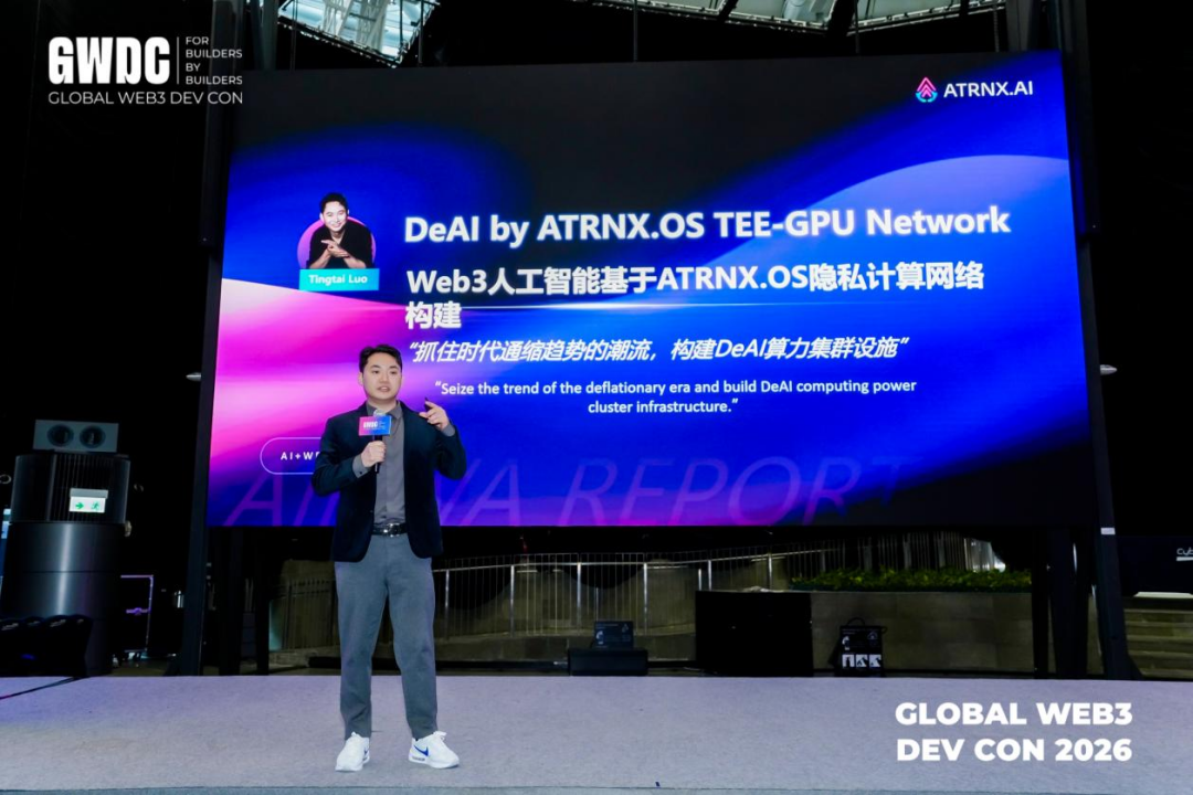 [香港,2026年2月9日] —— 在近日于香港举办的「全球Web3开发者大会2026」上,ATRNX.AI 全智能Agent创始人罗汀泰受邀出席,并于当天下午发表题为《DeAI by ATRNX.OS TEE-GPU Network:基于隐私并算网络构建去中心化人工智能》的跨年演讲。演讲聚焦于AI与Web3融合的技术前沿与全球业务战略,正式发布了以 ATRNX.AI Agent技术逻辑 与 去中心化人工智能(DeAI)边缘隐私算力网络为核心的双轮驱动规划,旨在引领行业进入以“认知工程”与“极致通缩”为特征的下一代AI时代。