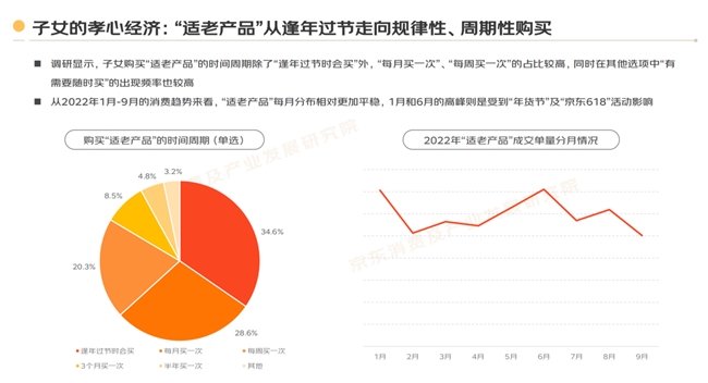 足力健的品牌实践,完美诠释了 “孝心经济既是银发经济,更是情感经济”的双重属性。足力健的消费场景已从春节、中秋等传统节日,延伸到生日、双休日、日常探望等多个日常生活场景,根据《京东:2022银发族消费趋势报告》显示,“适老产品”消费正从逢年过节走向规律性、周期性购买。调研显示,子女购买“适老产品”的时间周期除了“逢年过节时会买”外,“每月买一次”占比28.6%“每周买一次”占比20.3%,印证了孝心经济 “日常化渗透” 的趋势。