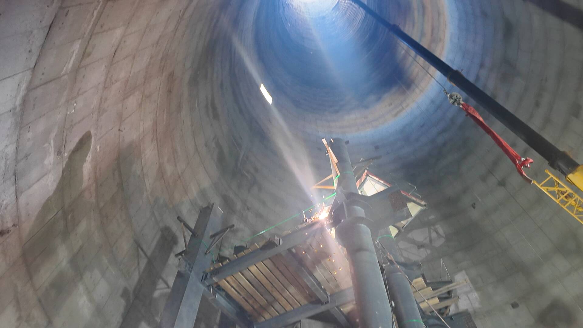 由于狂风从吸热塔顶部的开口往里猛灌,塔内气压远大于外边,强大的“风筒效应”让门死死地“吸”在了塔壁上。在一名工人的帮助下,记者终于进到塔内。几名工人正在焊接安放好的第1节钢结构,为第2节钢结构的吊装做准备。