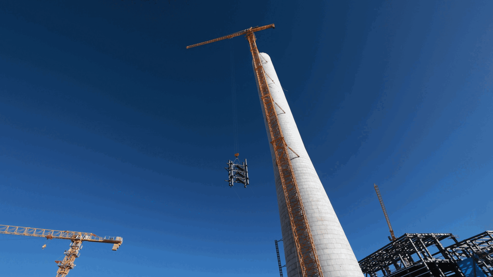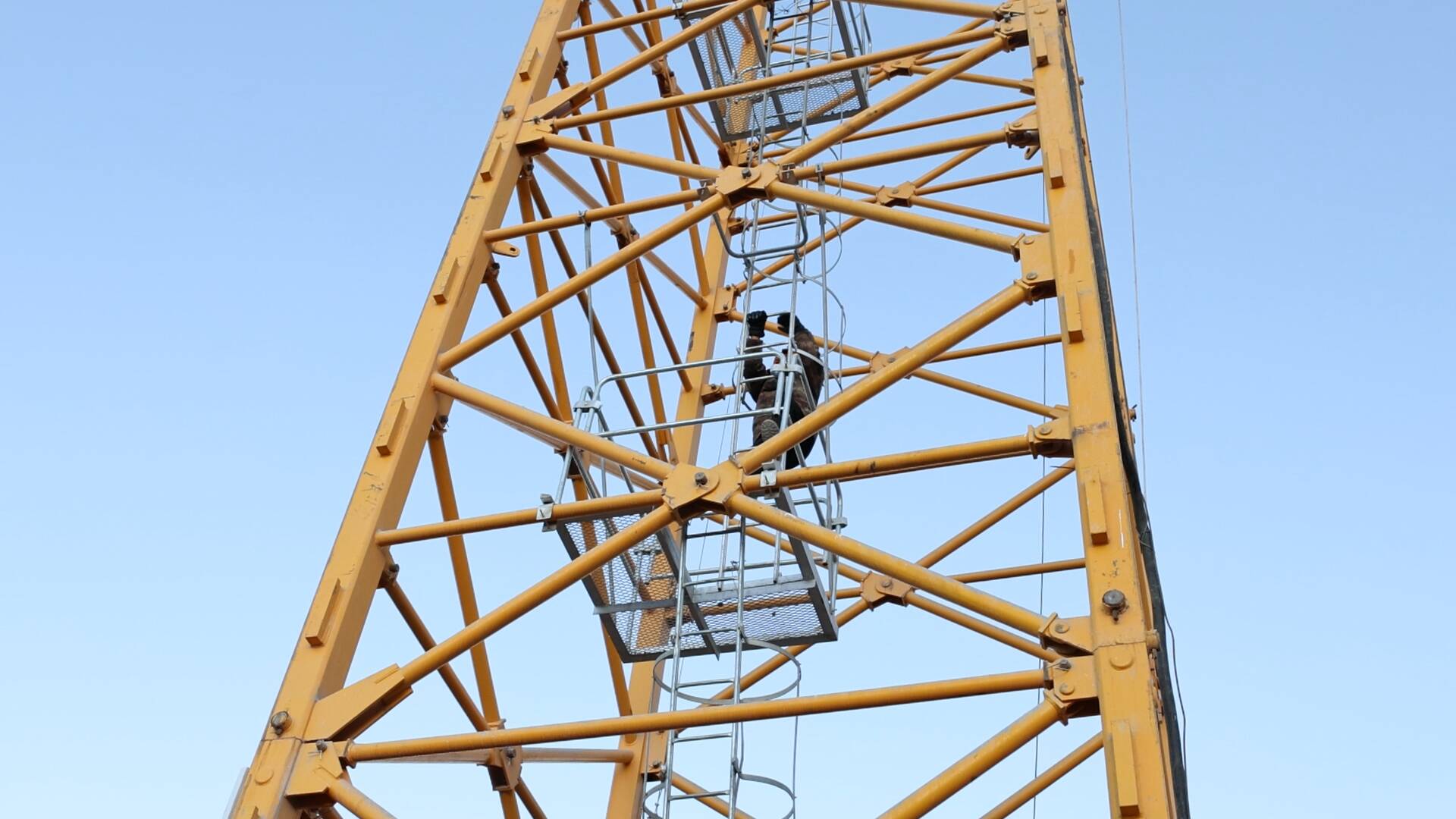 熔盐能把太阳能转化的热能储存起来,让电站在夜间也能持续发电。工人们要用16节钢结构搭建起27层平台,每节钢结构从塔外通过塔吊往里吊装。冬季高原每天下午经常刮大风,第二节的吊装选在上午,可作业平台还没焊完,眼看着要起风,塔吊司机尹家兵抓紧就位。