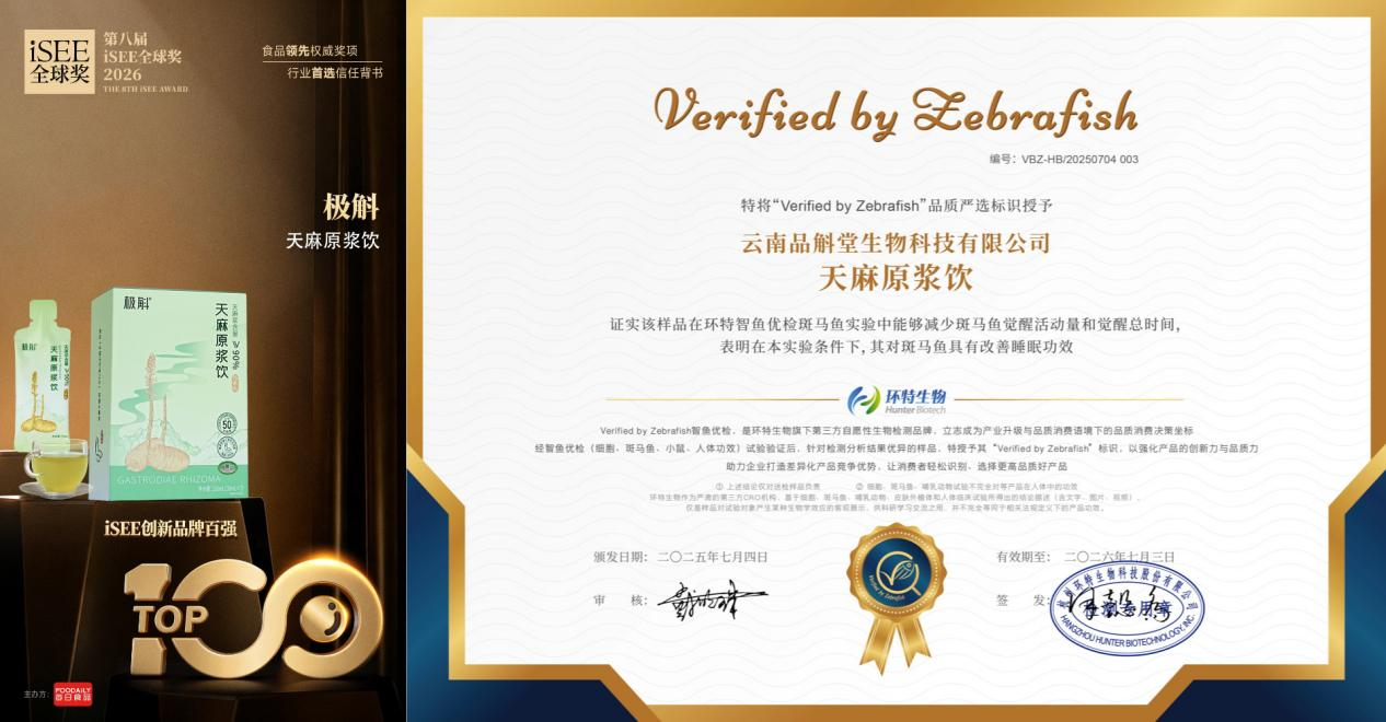 产品核心数据亮眼:每100mL含天麻素及对羟基苯甲醇总量达50mg以上,天麻素具抗氧化、调节神经等作用,对羟基苯甲醇更易透过血脑屏障。产品0蔗糖、0脂肪、0防腐、0增稠,全程无菌罐装,配料仅含乌天麻浆与低聚果糖。尤为值得一提的是,该产品通过斑马鱼模型验证可改善睡眠,并获“Verified by Zebrafish”标识(由杭州环特生物授予),品质可靠性得到第三方权威认证。