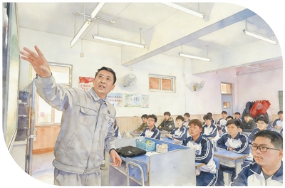 在天津市汉沽中专,全国人大代表、中石化第四建设有限公司工匠学院焊接教练张振连(左一)为学生们授课。新华社记者 孙凡越摄