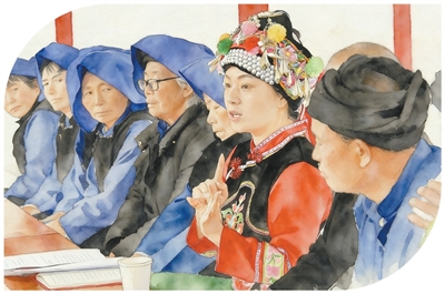 全国人大代表、云南省大理白族自治州南涧彝族自治县碧溪乡凤仙村村民鲁丽华(右三)在南涧彝族自治县无量山镇新政村宣讲全国两会精神。适志宏摄(新华社发)